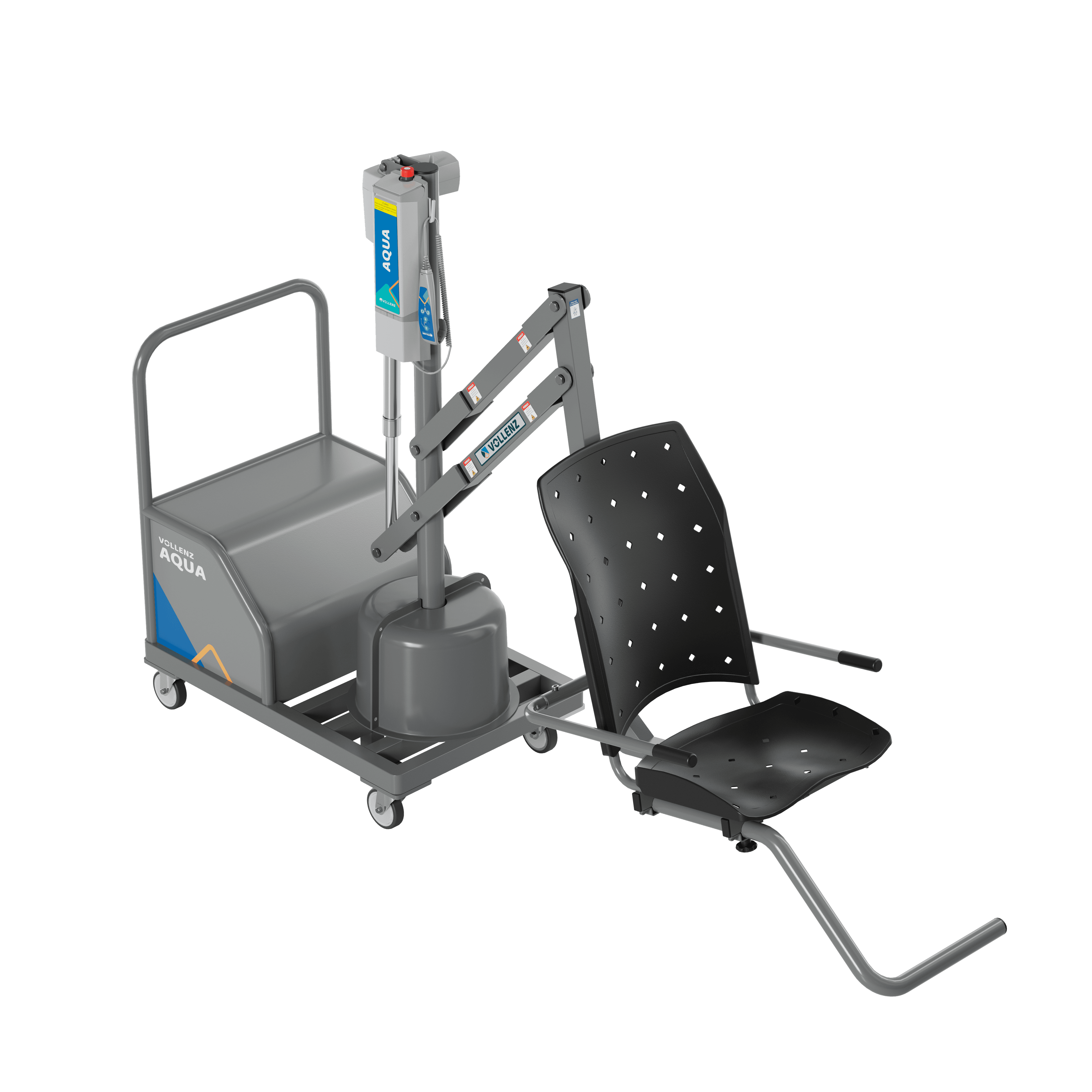 Cadeira ergonômica, fácil para o usuário se transferir. O movimento de acesso à piscina é suave e constante.